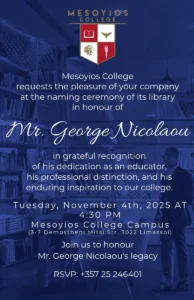 Mesoyios College is pleased to announce a special ceremony to name its library in honour of Mr. George Nicolaou, in recognition of his outstanding dedication to education, his distinguished professional achievements, and his lasting impact on our college community.